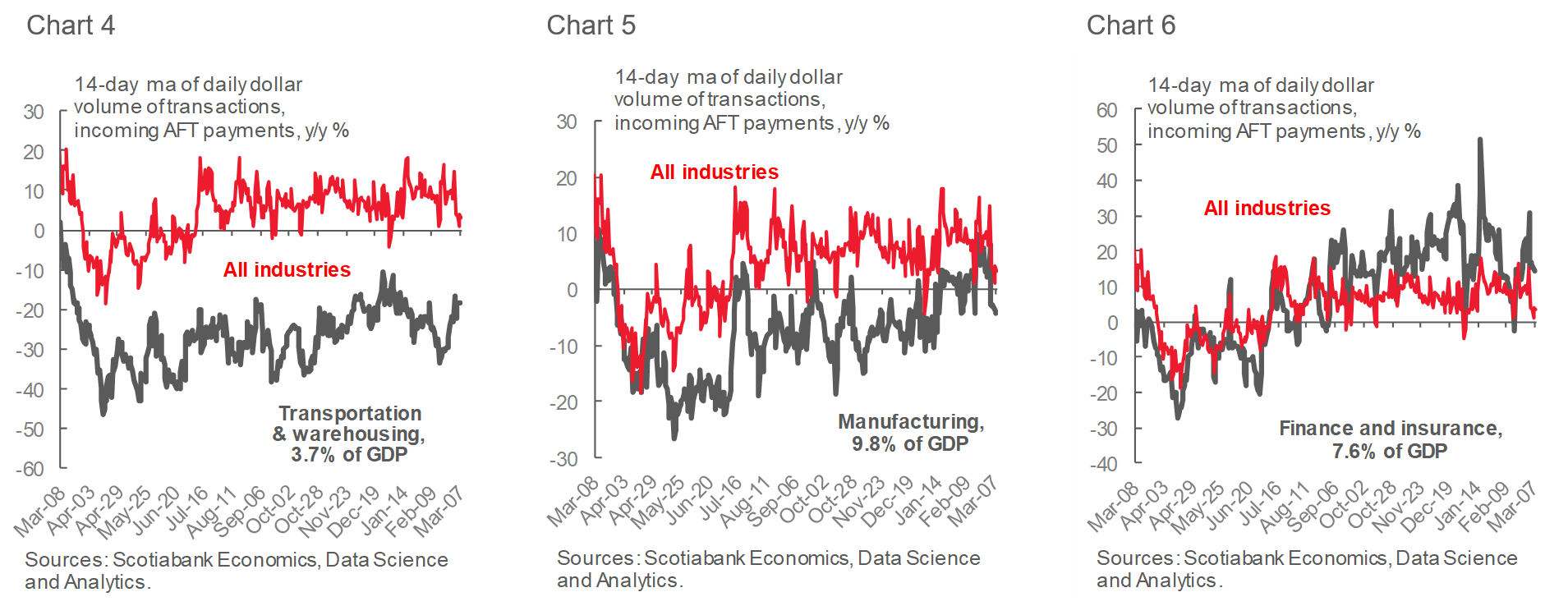 Growth in incoming payments in wholesale, retail and manufacturing sectors subsided in the last few weeks. Firms in the wholesale sector enjoyed a strong influx in transactions in mid-February, which seems to have run its course now. Growth in manufacturing payments has fallen below last year’s levels recently (Charts 2-6).