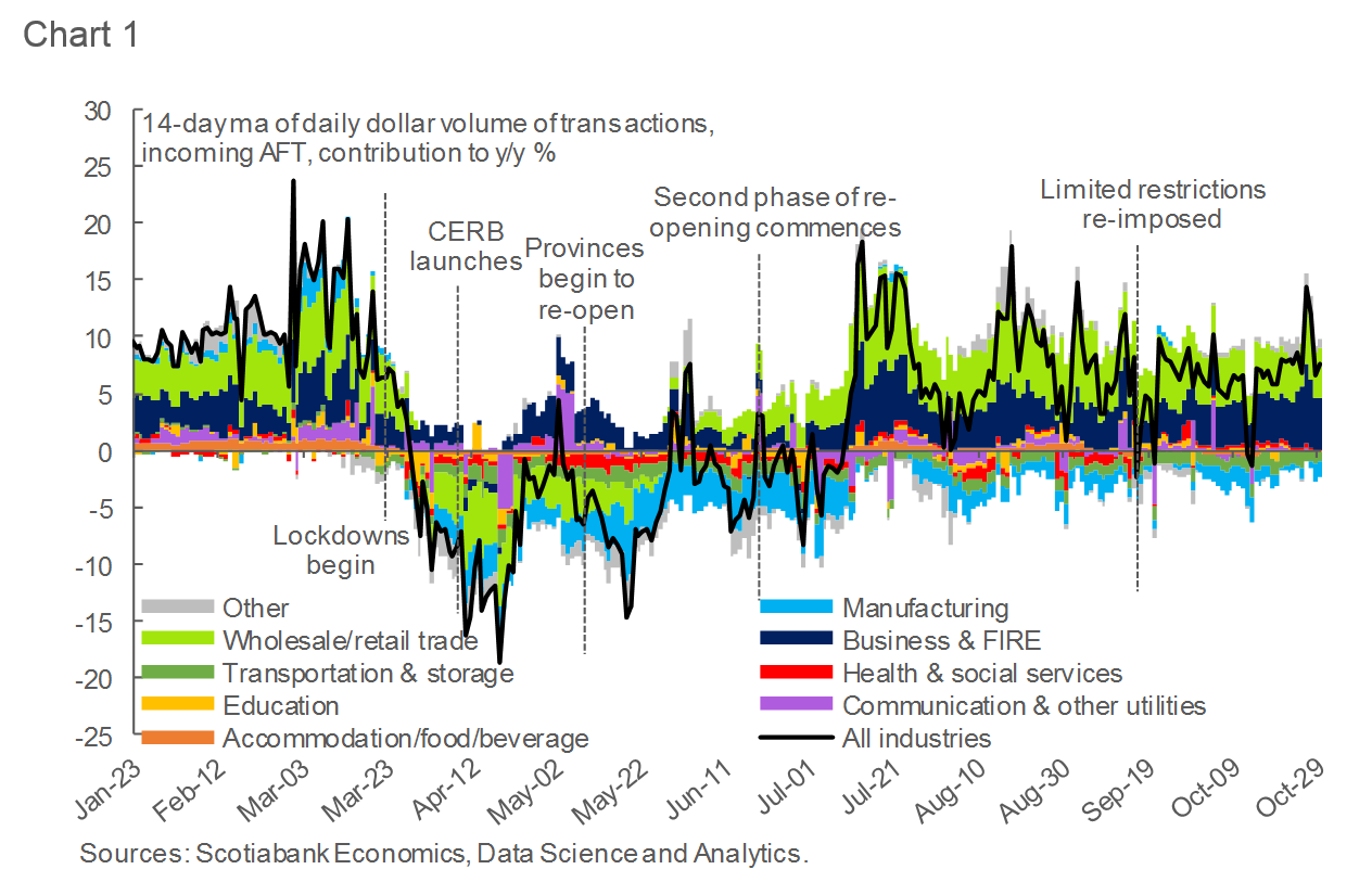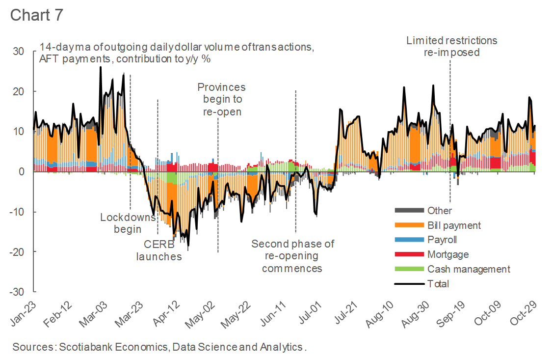 -Note that the mapping from the volume of transactions to measures of economic activity (e.g. GDP) is imperfect, and so care must be taken when drawing the implications. - The AFT payments show bill payments to/from companies in Canada.
