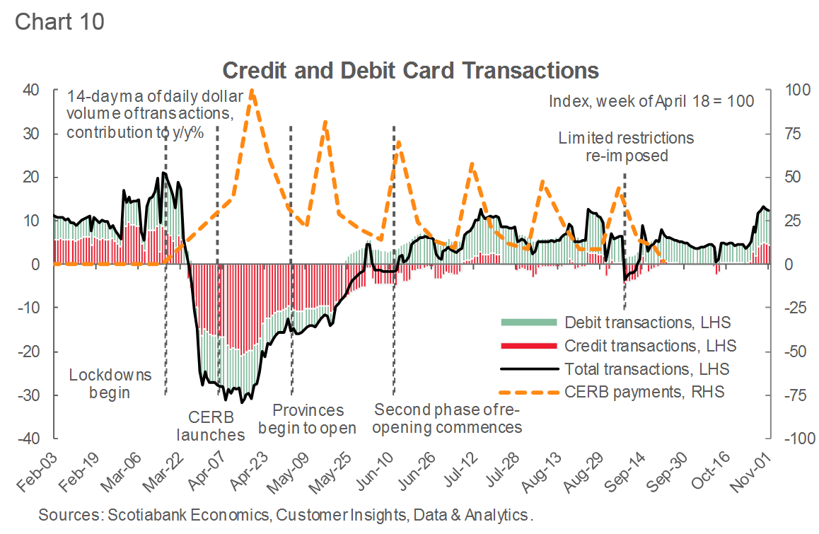 -Growth in card spending in Ontario and Quebec continued to underperform the aggregate average in October, hampered by restrictions to contain the spread of COVID-19. Some restrictions are scheduled to be relaxed in the coming days in Ontario, likely boosting spending in the affected categories.