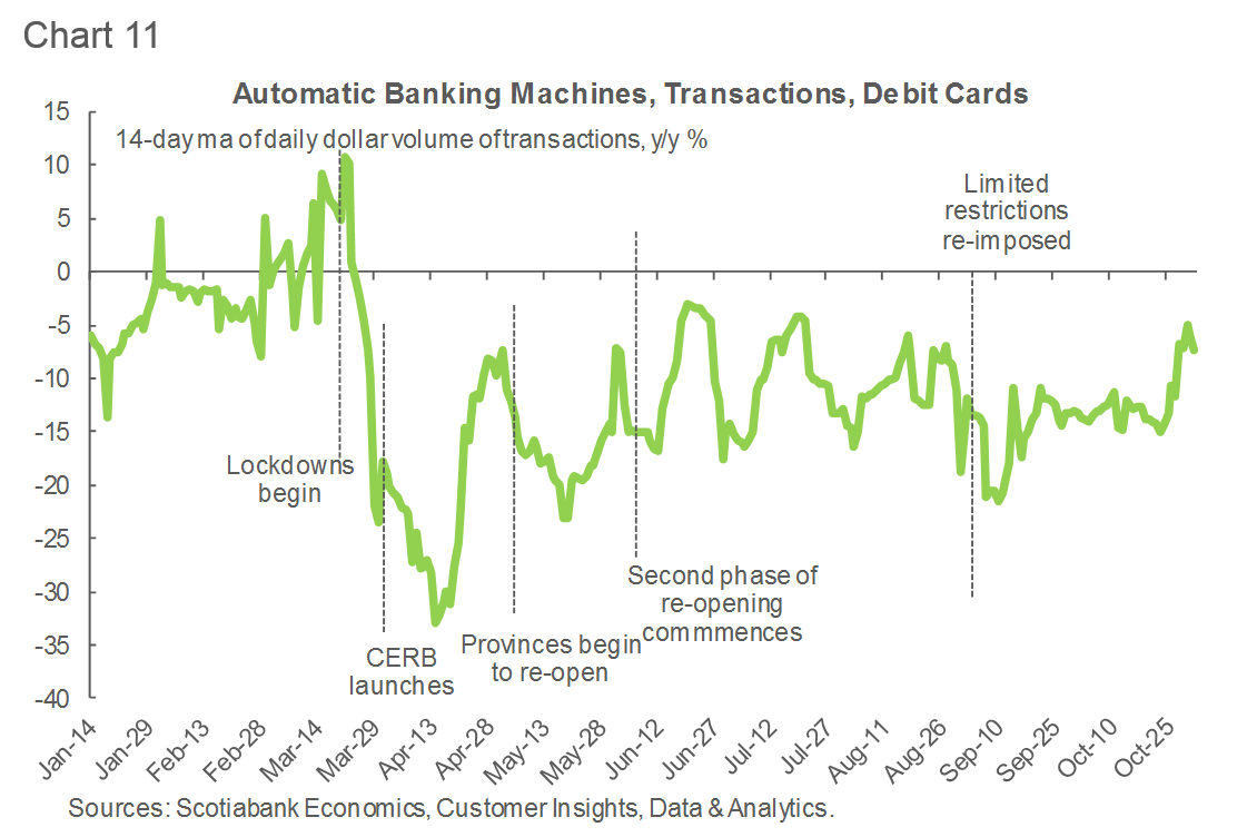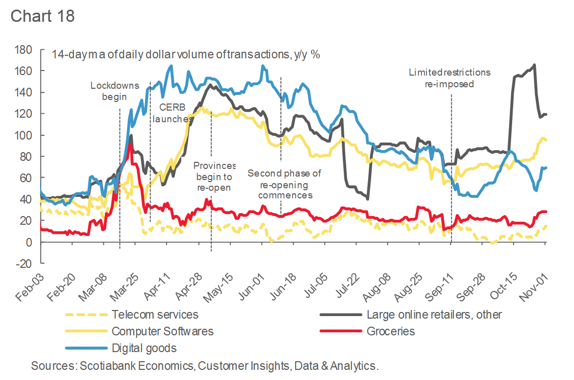 - Growth in the card transactions in Ontario and Quebec continued to underperform the aggregate average and most other provinces in October (Charts 12-15), as the re-introduction of restrictions to contain the spread of COVID-19 reduced spending at local restaurants and other businesses. Some of these restrictions are scheduled to be relaxed in the coming days in Ontario, likely boosting spending.