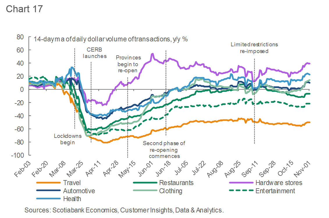 - Looking at categories that declined during the lockdowns in the spring, growth is again diverging, as spending on goods (e.g. items related to autos, clothing, hardware), as well as on essential services like health, remains strong (Chart 17).