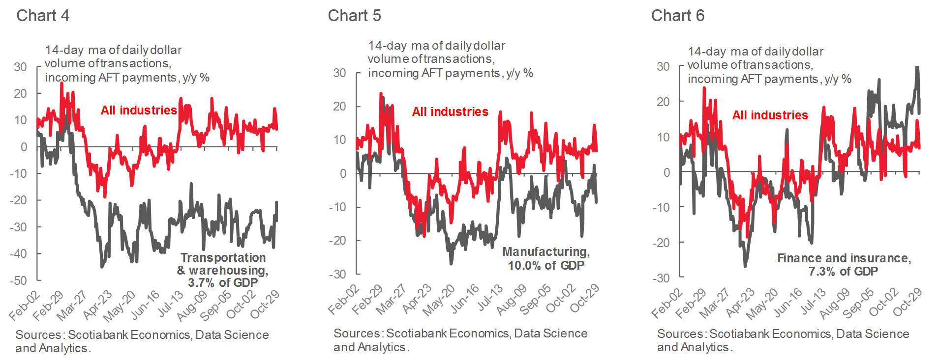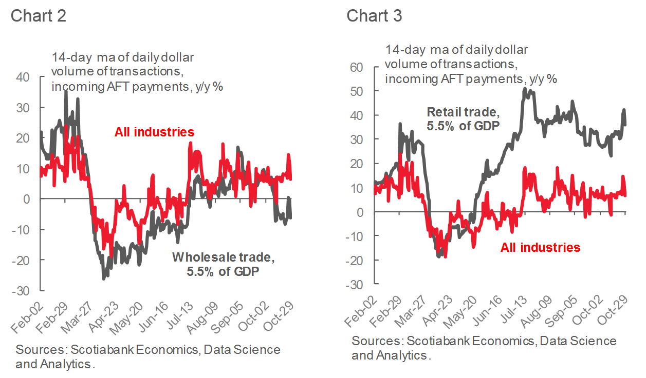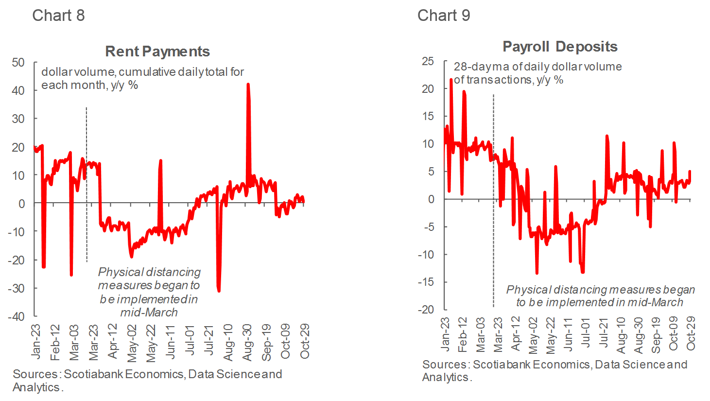 -Growth in outgoing payments has been relatively stable between 10 and 12 per cent in October. Payroll deposit growth picked up slightly towards the end of October, while rent payments have been running flat relative to last year’s levels, with no sign of a turnaround yet. - Growth in consumer transactions, available through November 1st, picked up over the last week, as an unusually low total observed on one day last year made the y/y comparison temporarily more favourable:
