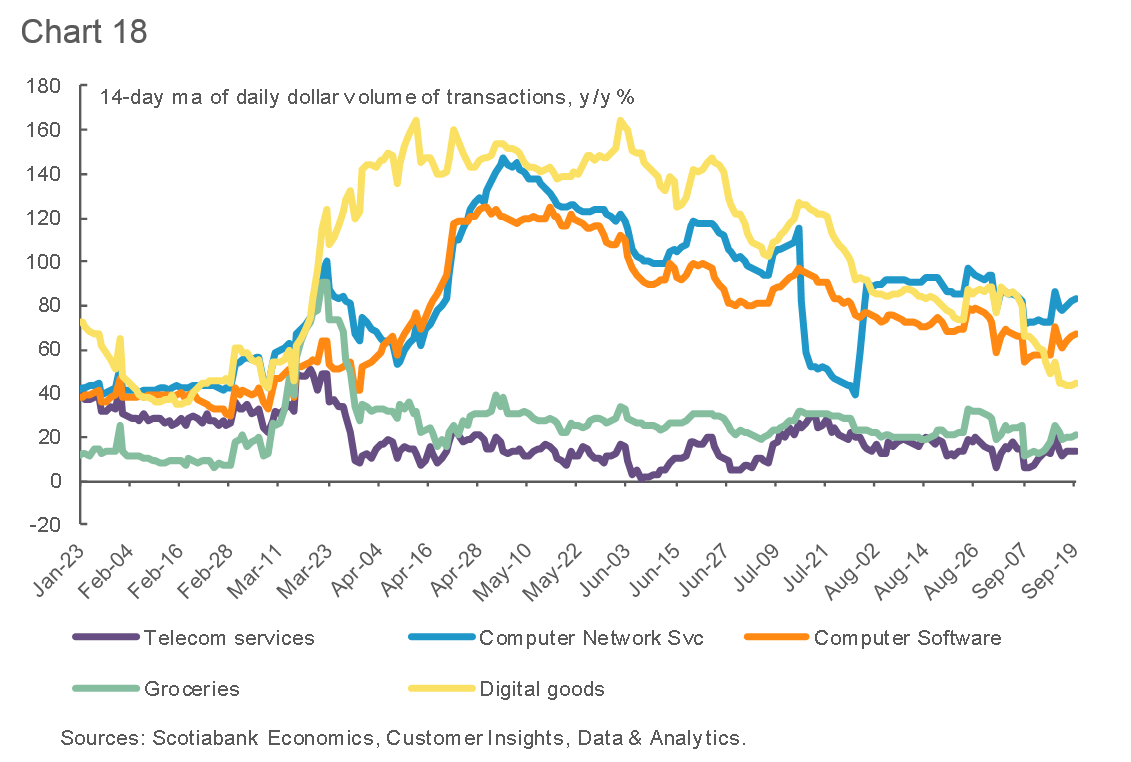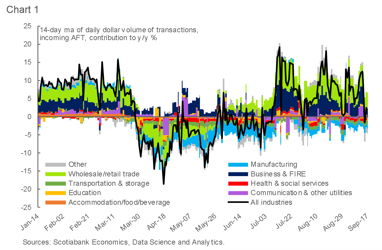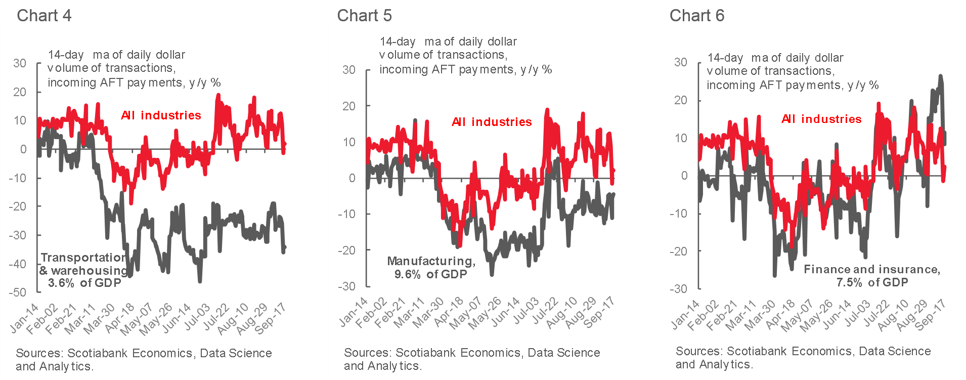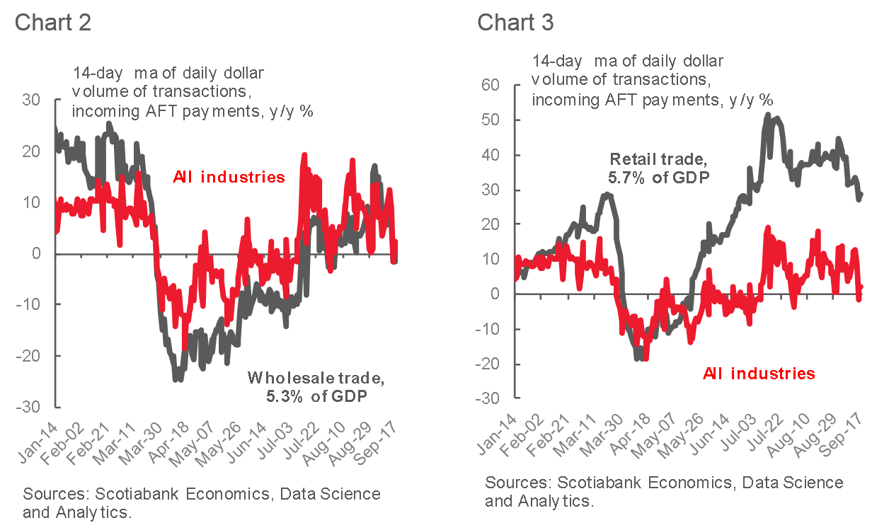 -Payroll deposits, while volatile, showed a tendency to ease back in September compared to last year’s levels, which could point to a nascent labour market weakness. - Growth in consumer transactions, available through September 19th, has edged down also in September: