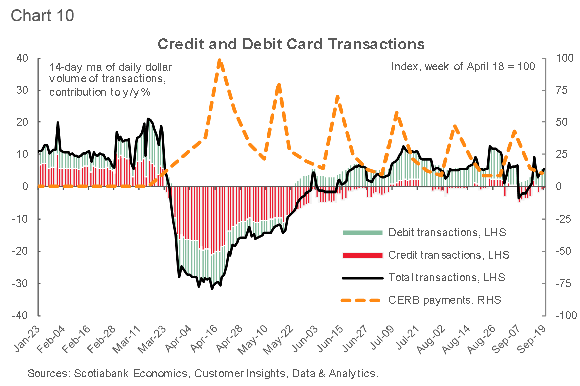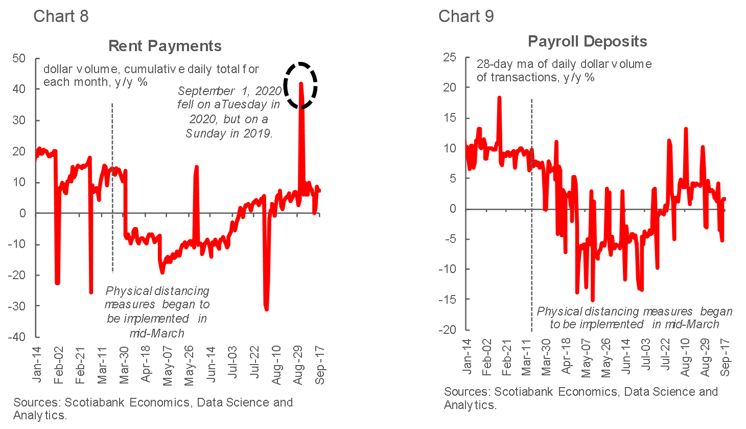 -Payroll deposits, while volatile, showed a tendency to ease back in September compared to last year’s levels, which could be a sign of the nascent labour market weakness (Charts 8 and 9).