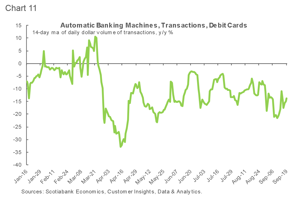 - The volume of transactions through automatic banking machines (ABMs) mirrored other indicators declining in mid-September, before rising slightly in the last few days (Chart 11).