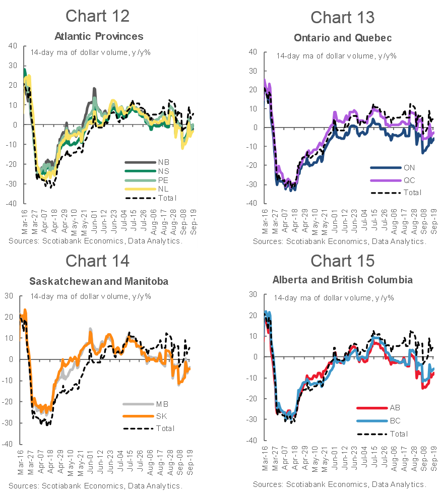 - Province-level data shows a consistent trend, with spending totals declining in mid-September relative to 2019 (Chart 12-15).