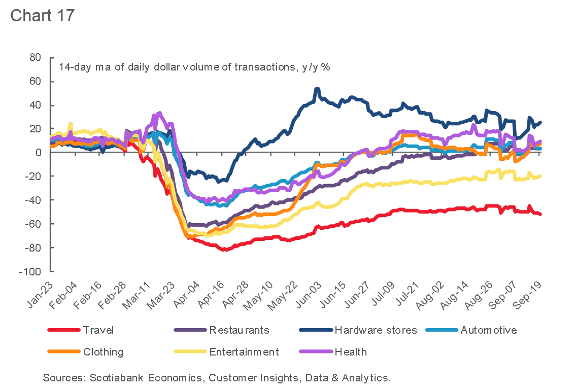 -Groceries and hardware stores, as well as travel-related merchants saw declining y/y spending growth in mid-September, before a tentative turnaround.