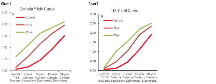 If ever the two central banks are to achieve their inflation goals—plus the Fed’s full employment part of its dual mandate—the conditions may be the ripest for doing so in many years on the back of vaccines, pent-up demand, massive stimulus overshoots and a more restrained supply side of the economy than in the past. That is forecast to lift the US 10 year Treasury yield to 1.9% toward year-end with slight outperformance in Canada 10s.