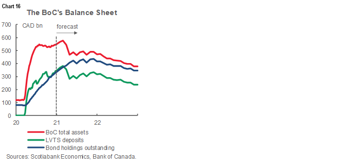 There are three reasons guiding expected further tapering of Government of Canada bond purchases at a pace of C$4 billion or more per week. Our forecast is for a reduction to C$3 billion or more per week by 2021Q2 and as soon as the April MPR and then C$2 billion/week by about September before the program is wound down at year-end.