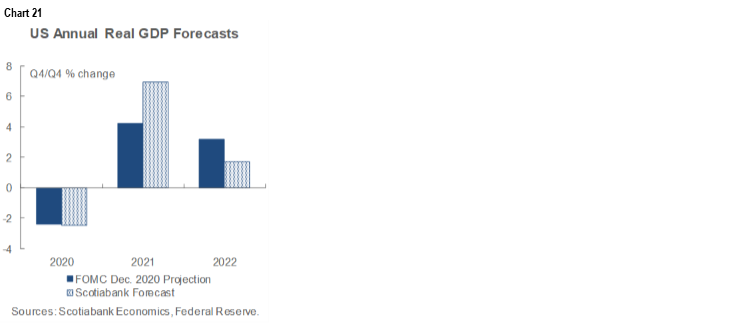 The Federal Reserve is forecast to tighten policy in stages starting over the second half of this year. The effects are expected to be disruptive to markets but possibly in a lighter version of what happened in 2013–14 at least for the bond market. The fundamental drivers have already been discussed and they are expected to result in the FOMC revising upward its projected growth this year compared to the December forecasts that did not fully incorporate fiscal policy and vaccine effects (chart 21).
