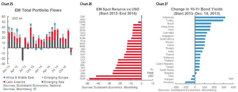 Recall that in 2013, the initial taper tantrum resulted in a large withdrawal of portfolio flows from emerging markets (chart 25). This was true across both equities and bonds. The second-round response continued to offer capital flows, but the market demanded a steadily higher return which drove many currencies sharply lower over 2013–14 (chart 26). This was not just the case for EMs either, as other higher beta currencies weakened—such as the Canadian dollar that depreciated by over a dozen cents from early 2013 through to early 2014. The repricing of the US 10-year note and capital flight from EMs also drove their own bond yields sharply higher (chart 27).