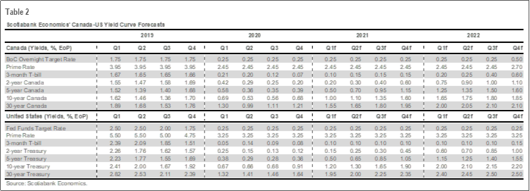 Scotiabank Economics believes the next policy rate move will be up based upon the views expressed thus far, but it’s worth assessing a lingering alternative risk. There has been considerable debate over the merits and likelihood of a small 10–15 basis point rate cut that would bring the Bank of Canada’s overnight lending rate to between 0.10% and 0.15%. This would require the Bank of Canada to lower its present guidance that the effective lower bound is 0.25% and hence the estimate of where rate cuts begin to court greater risk than reward.