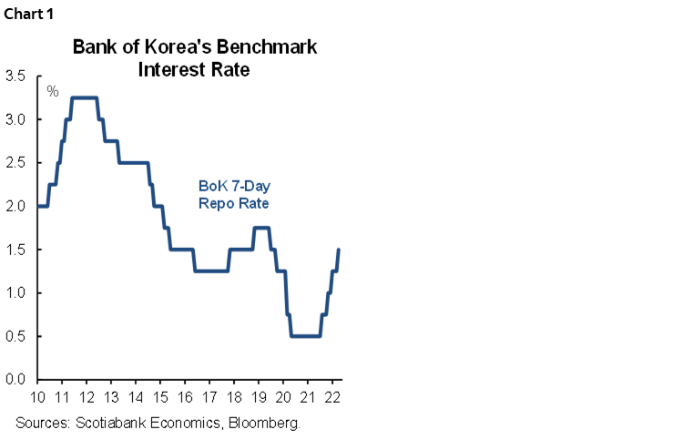 - The Bank of Korea continued to normalize monetary conditions by increasing the benchmark interest rate by 25 basis points to 1.50%.