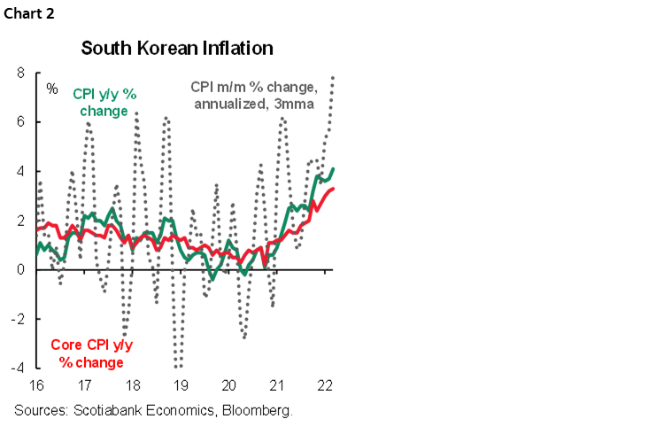 Inflationary pressures are building in South Korea, requiring a monetary policy response. Prices at the headline level increased by 4.1% y/y in March, while annualized monthly price gains (which allow us to see the current trend in inflation without the impact of year-ago base effects) show that “true” price pressures are twice as high (chart 2). The central bank expects headline inflation to remain “high in the 4% range for some time”. Indeed, our estimations point to 4.5–5% y/y inflation through the third quarter of 2022, after which we expect inflation to ease slightly to 3.7% y/y by the end of the year. Similarly, core inflation, at 3.3% y/y in March, remains well above the BoK’s 2% inflation target. The BoK expects it to “remain around 3% for a considerable time”. We assess that South Korea’s fight against inflation will not be short-lived, as prices pressures will likely persist due to elevated core prices, higher inflation expectations by the general public, as well as firms’ price-setting behaviour that is likely to pass some of the elevated input costs to consumers. Accordingly, we do not foresee headline inflation returning to the BoK’s 2% target before 2024.