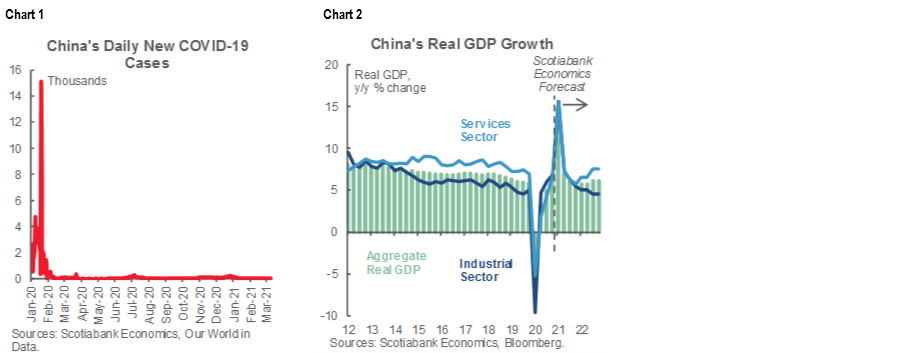 The Chinese economy continues to recover from the COVID-19 crisis, assisted by supportive fiscal and monetary policies and effective containment of the virus (chart 1). After the economy rebounded to positive growth territory in the second quarter of 2020, the recovery has gradually become more broadly-based. Indeed, China’s industrial sector is no longer the primary source of growth as momentum is also underpinned by solid services sector activity (chart 2). In 2020, China was an exception among the world’s major economies as it was able to grow its GDP; its output expanded by 2.3%.