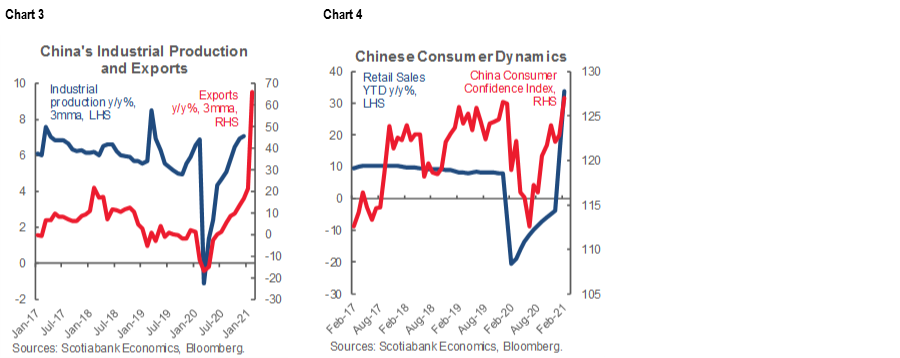 The Chinese government has set the nation’s annual consumer price inflation target at “around 3%” for 2021. Inflationary pressures remain low for the time being; in fact, the consumer price index dipped into deflation in early 2021 (chart 7), though we expect this to be a temporary phenomenon. We forecast headline inflation to accelerate towards 2% y/y by the end of 2021 on the back of base effects, strengthening demand dynamics and higher commodity prices. Price pressures further up the distribution chain are already building as implied by the producer price index that has resumed an upward trajectory after being in deflationary territory for most of 2020 (chart 7 again).