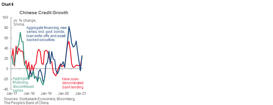 In response to the pandemic, the Chinese financial system increased credit supply substantially in 2020 (chart 6) as the PBoC directed banks to increase lending to affected industries. The credit boom—combined with banks’ ability to extend loan maturities because of the pandemic—has triggered our concerns regarding China’s loan quality. We assess that financial instability is set to increase over the coming quarters, especially in 2022 and beyond as the impact of stimulus measures fades and the country’s economic growth steadies at a lower level. Indeed, the International Monetary Fund has noted that credit quality in China has deteriorated due to repayment holidays and relaxed rules for handling bad loans. Accordingly, the Fund has urged Chinese authorities to strengthen bank transparency and governance. As the worst of the economic crisis is now over, Chinese monetary authorities will likely be increasingly focusing on addressing financial risks and imbalances that may have resulted from inefficient allocation of credit during the pandemic. Indeed, the PBoC is now encouraging lenders to rein in credit supply. According to the NPC, China’s money supply and total social financing growth will be in line with nominal GDP gains this year, which we forecast to be around 10% y/y. Last year, annual broad money supply (M2) and aggregate financing growth averaged 10.3% and 38.0%, respectively, compared with nominal GDP growth of 3.0% y/y.