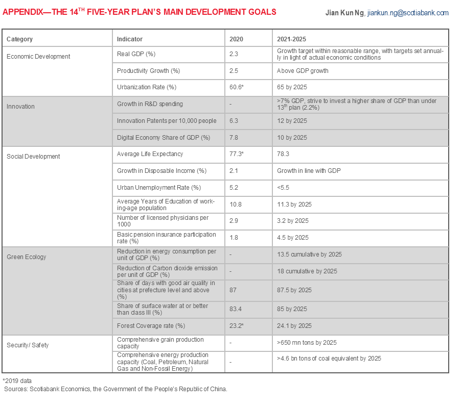 China’s 14th Five-Year Plan, covering the years from 2021 to the end of 2025, was tabled at this year’s NPC (please see the Appendix for China’s economic development goals for 2021–2025). The Chinese government opted not to set an average annual growth target for the next five years; instead, policymakers expressed commitment to keeping economic growth within a reasonable range. We assess that this change provides policymakers with greater flexibility, enabling them to ensure sustainable leverage in the economy and implement structural reforms. The Five-Year Plan centers around the “Dual Circulation” development strategy, in which internal and international sides of the Chinese economy complement each other (chart 5). On the internal side, the strategy focuses on innovation-driven development and industrial modernization as China seeks to reduce its reliance on exports for technology products. Simultaneously, policymakers will focus on supporting Chinese consumers, employment and private sector investment in order to increase the importance of domestic demand to the overall economy. The government’s international goals encompass further trade and investment integration and structural reforms, steps that will help increase China’s relevance in the global economy. For further details on the “Dual Circulation” strategy, please refer to this report.