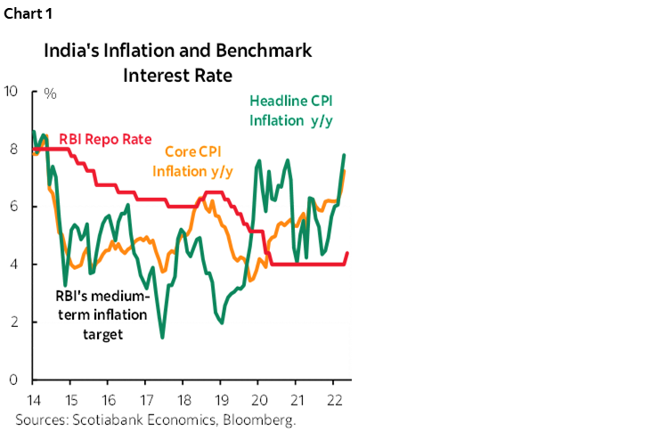 The Reserve Bank of India (RBI) raised the benchmark repurchase rate by 50 basis points to 4.90% following the monetary policy meeting that concluded today (chart 1). The decision marks the second hike in the monetary policy normalization phase that commenced on May 4 when the RBI raised the repurchase rate by 40 bps following an unscheduled policy meeting. The front-loading of hikes highlights the sense of urgency within the central bank to prevent inflation expectations from rising rapidly and to support the Indian rupee, which has faced a weakening bias against the US dollar on the back of capital outflows. Accordingly, more interest rate increases are in sight; the central bank pointed out that it will “remain focused on withdrawal of accommodation to ensure that inflation remains within the target going forward”. We expect additional hikes to be announced at each of the policy meetings in August, September, and December, taking the benchmark repo rate to 5.75% by the end of the year.