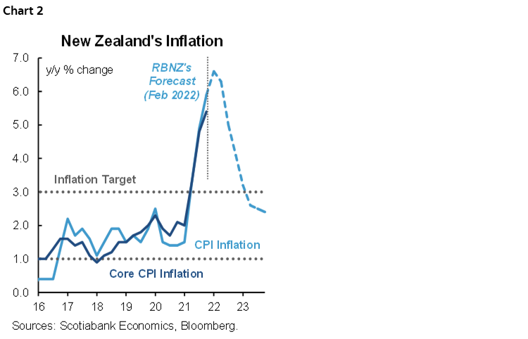 The Reserve Bank of New Zealand’s (RBNZ) Monetary Policy Committee raised the Official Cash Rate (OCR) by 50 basis points to 1.50% following the April 13 policy meeting (chart 1). We—and the analyst consensus—had anticipated a 25 bps hike. Before this move, the central bank had lifted the policy rate by 25 bps at each of the prior three meetings (in February, November, and October). Continued monetary tightening is needed in New Zealand in the face of elevated inflation and a tight labour market. Indeed, the RBNZ’s policymakers assess that frontloading rate hikes is needed to help contain rapidly rising inflation expectations (chart 1). Moreover, the RBNZ sees that hiking more aggressively now builds policy buffers for the future given the uncertain global economic outlook. We expect further interest rate increases over the coming months, taking the OCR to 2.75% by the end of the year.