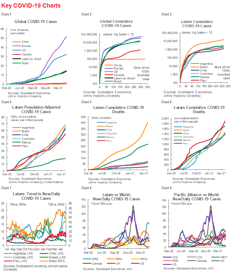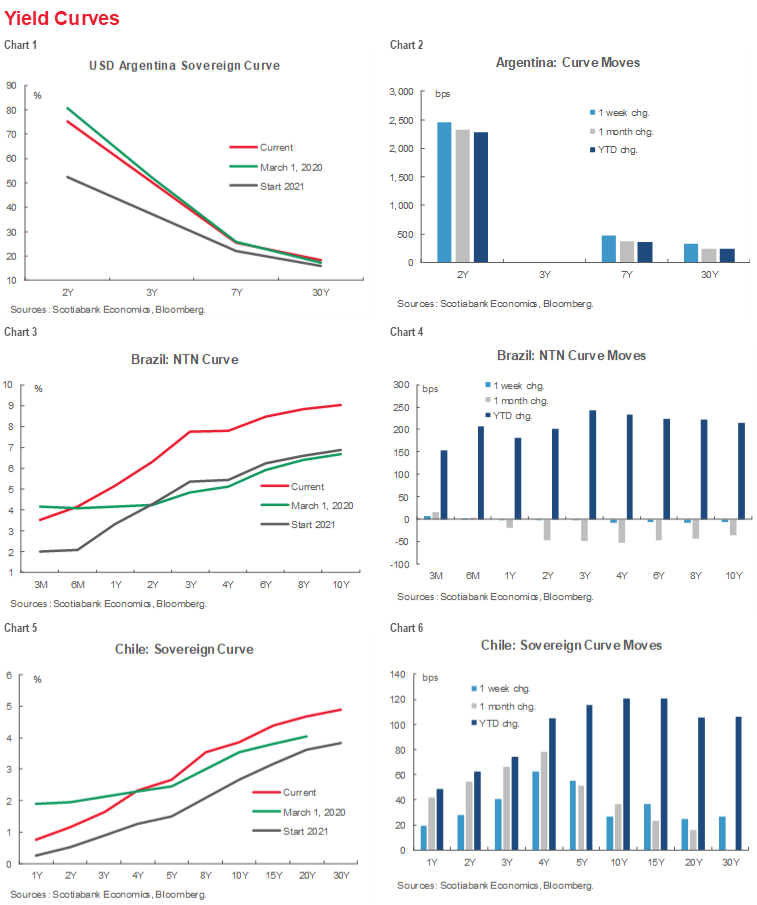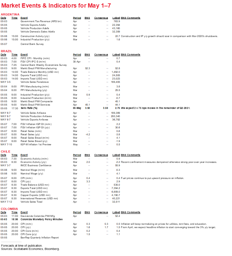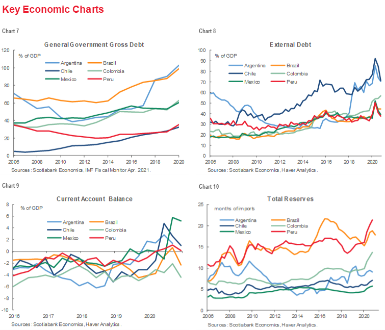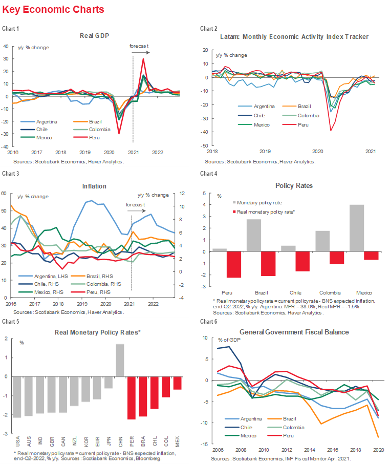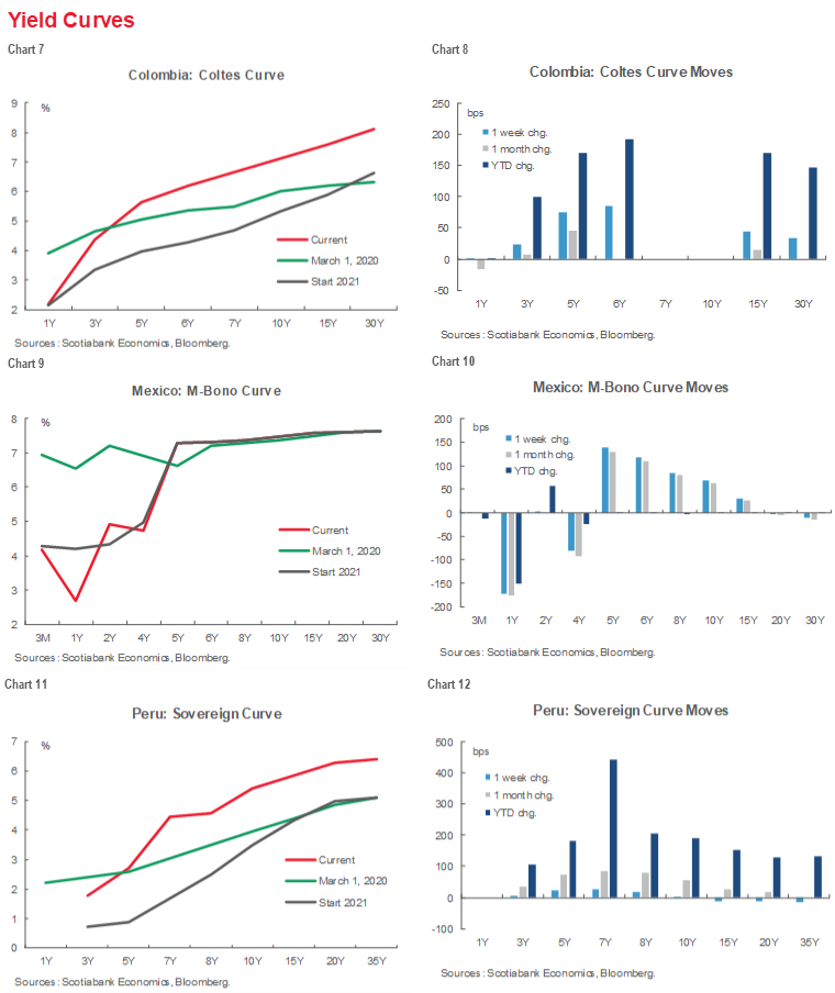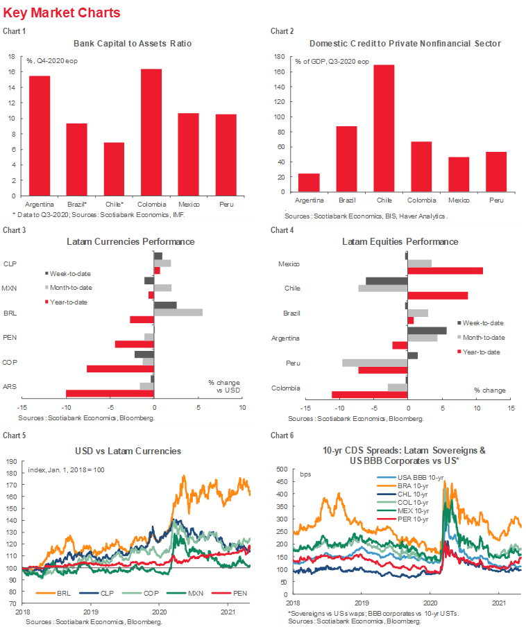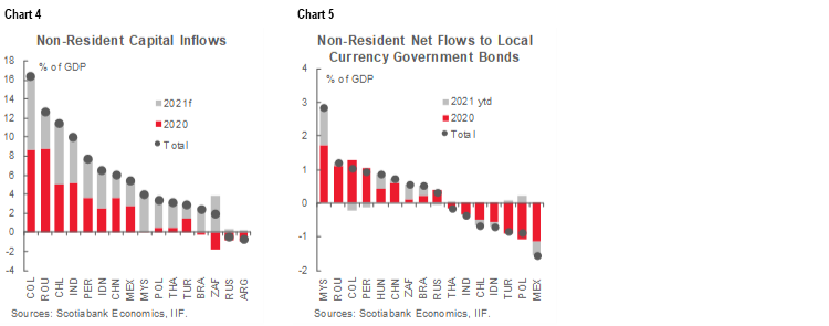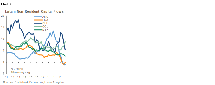 Looking specifically at available data on Latam’s major markets, investor flight last year from Mexico was amongst the quickest and deepest, and has remained quite persistent, notwithstanding an anomalous jump in the numbers in late-2020 related to rollovers of public-debt instruments. Although Mexico’s real interest rates have been amongst the highest in both the Latam and EM spaces over the last year and a half (chart 5, p. 3), this hasn’t been enough to compensate for other factors that have weighed on Mexican markets. In contrast, Brazil and Colombia appear to have seen nearly complete reversals of the foreign-capital outflows they experienced last year. High-frequency data on Argentina, Chile, and Peru are not available given the smaller size of their markets.