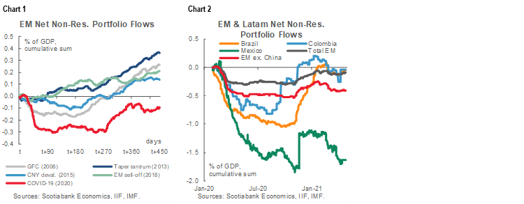 - In Latam, IIF daily estimates imply that Brazil and Colombia have outperformed the rest of EM with nearly complete recoveries in net foreign flows into their fixed-income and equity markets. In contrast, Mexico’s net non-resident portfolio flows remain close to their 2020 nadir.