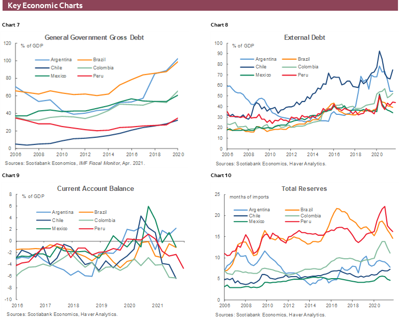 At the same time, global investors will be closely watching other indicators, including external debt (chart 8), current account balances (chart 9), and international reserves (chart 10). None point to impending concerns, though widening current account deficits in Chile and Colombia warrant monitoring.