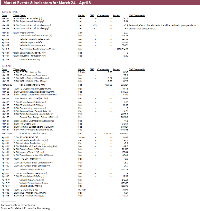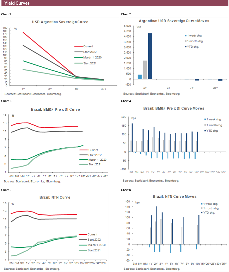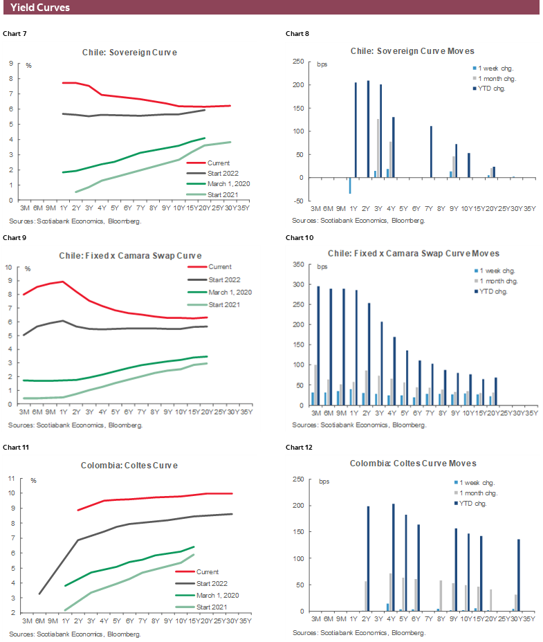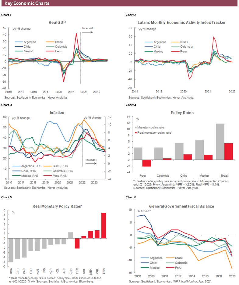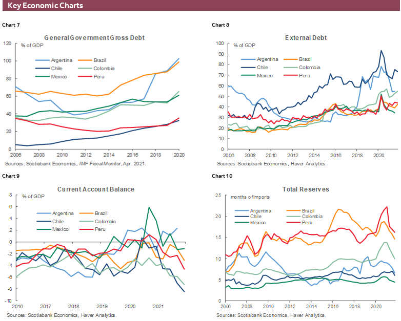 These effects would introduce additional uncertainty with respect to the near-term outlook. As the Key Economic Charts below illustrate, Scotiabank economists in the region project growth to broadly return to pre-pandemic levels (chart 1), consistent with the recent evolution of monthly economic activity indicators (chart 2). Meanwhile, even with higher commodity prices, inflation is expected to return to target, though the timing of that convergence has been pushed back somewhat (chart 3). But reining in those price pressures would require key policy rates, which have already increased over the past year, to increase even further (chart 4). And weaker growth would hamper efforts to restore fiscal balances that had deteriorated in the pandemic (chart 6), while key indicators closely watched by investors, such as debt-to-GDP ratios (chart 7), external debt burdens (chart 8), current account balances (chart 9), and international reserves (chart 10), would weaken.