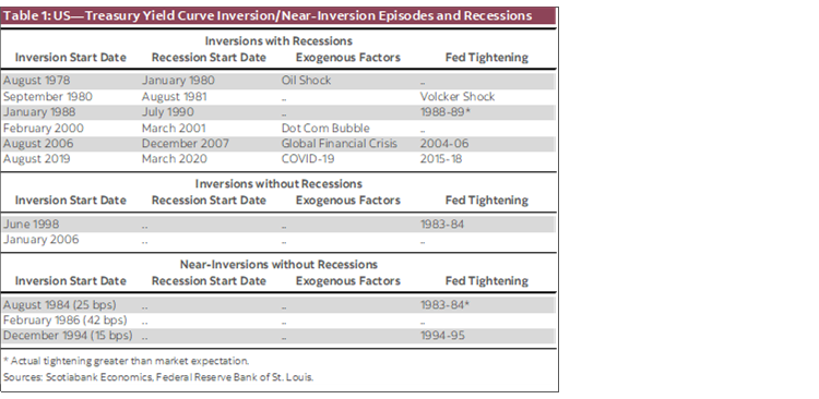 To begin, consider episodes in which yield curve inversion was followed by a recession (table 1, top panel). In all six cases, the slope of the yield curve turned negative in advance of the onset of recession, in some cases, well before, consistent with the hypothesis that forward-looking financial markets anticipate the coming downturn. Going forward, that predictive property may indeed prevail. But the fact that the lead time from the start of yield curve inversion to subsequent recession varies between seven and 31 months should give pause. Moreover, each of these cases was accompanied by a major exogenous shock (e.g., oil price shock) and/or an unexpectedly severe tightening of Fed monetary policy, such as the "Great Disinflation" undertaken by then-Fed Chair, Paul Volcker, in the early 1980s. Though it is possible that a recession would have transpired even in the absence of those exogenous events and monetary policy shocks, these episodes suggest that the connection between inversion and recession may be less tight than would appear at first glance.