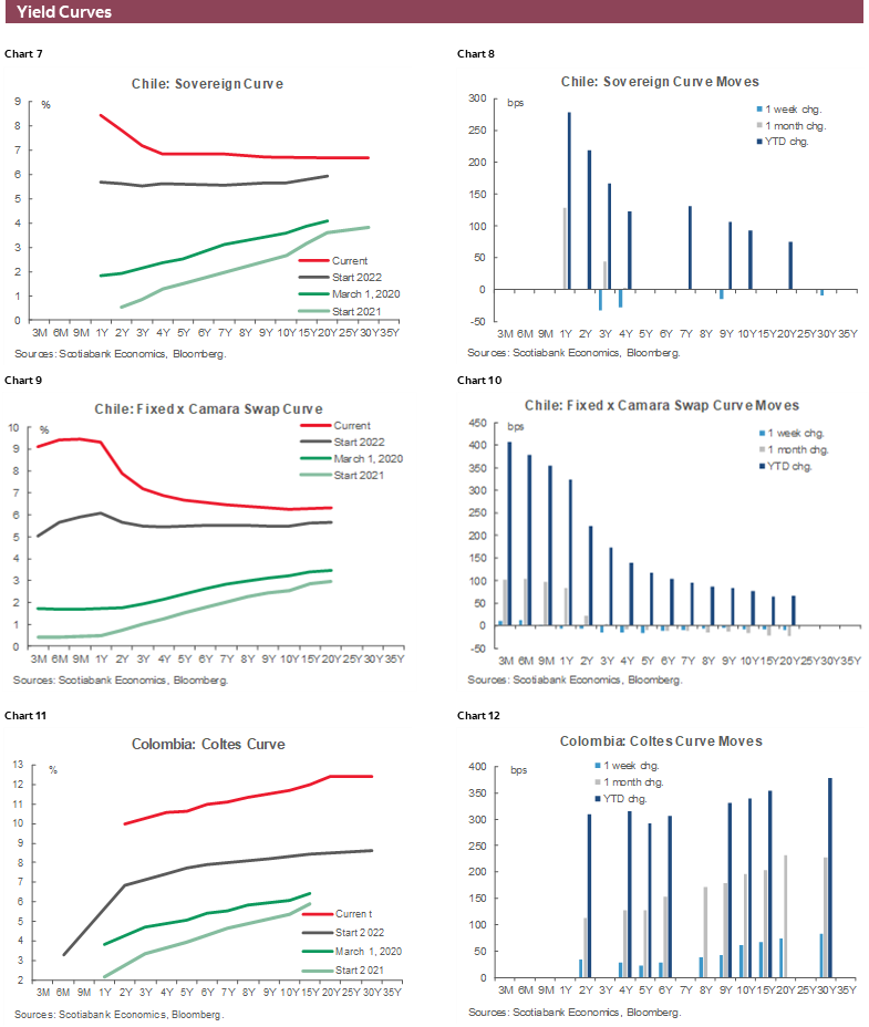 Yield curves across the Latam region are now largely inverted or flat. Colombia and Peru are exceptions here. Given that inverted yield curves can be a signal of a possible recession—though not a foolproof one—increased attention may be put on these indicators in the weeks and months ahead.