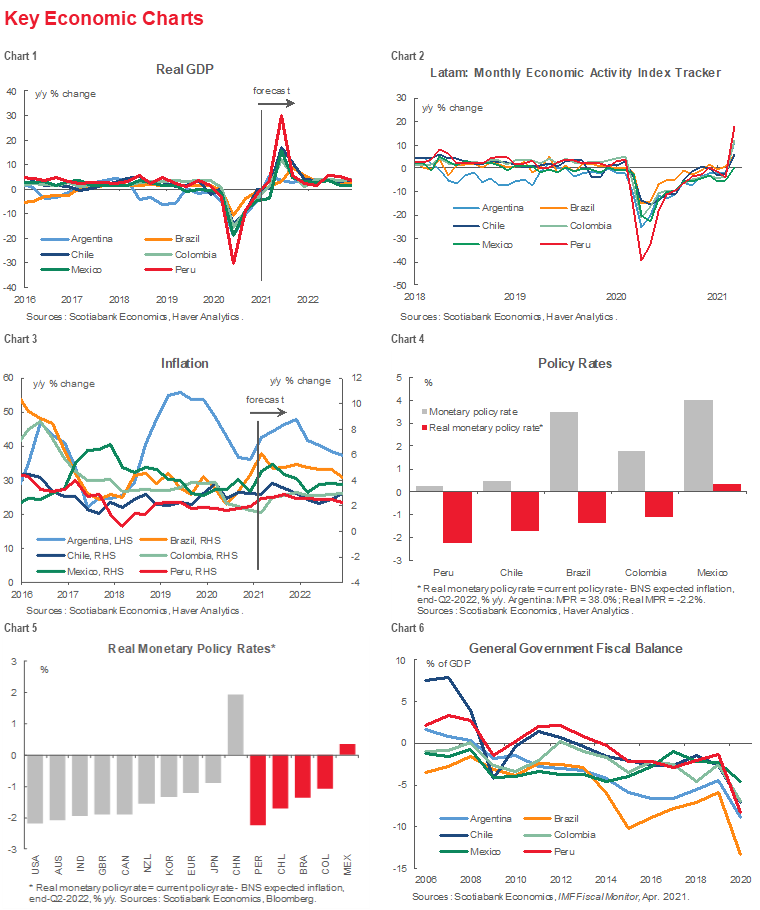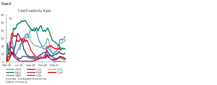 - Chile continues to remain miles ahead of the rest of Latam—and much of the world—with its exemplary roll-out of vaccinations (chart 3, again). But as vaccination rates start to ramp up gradually across the rest of Latam, new infection numbers (Key COVID-19 chart 7, again) and positivity rates (chart 4) continue to trend downward in Chile, Mexico, and Peru.