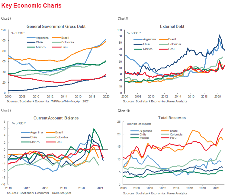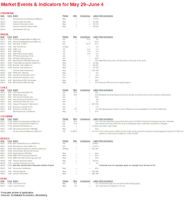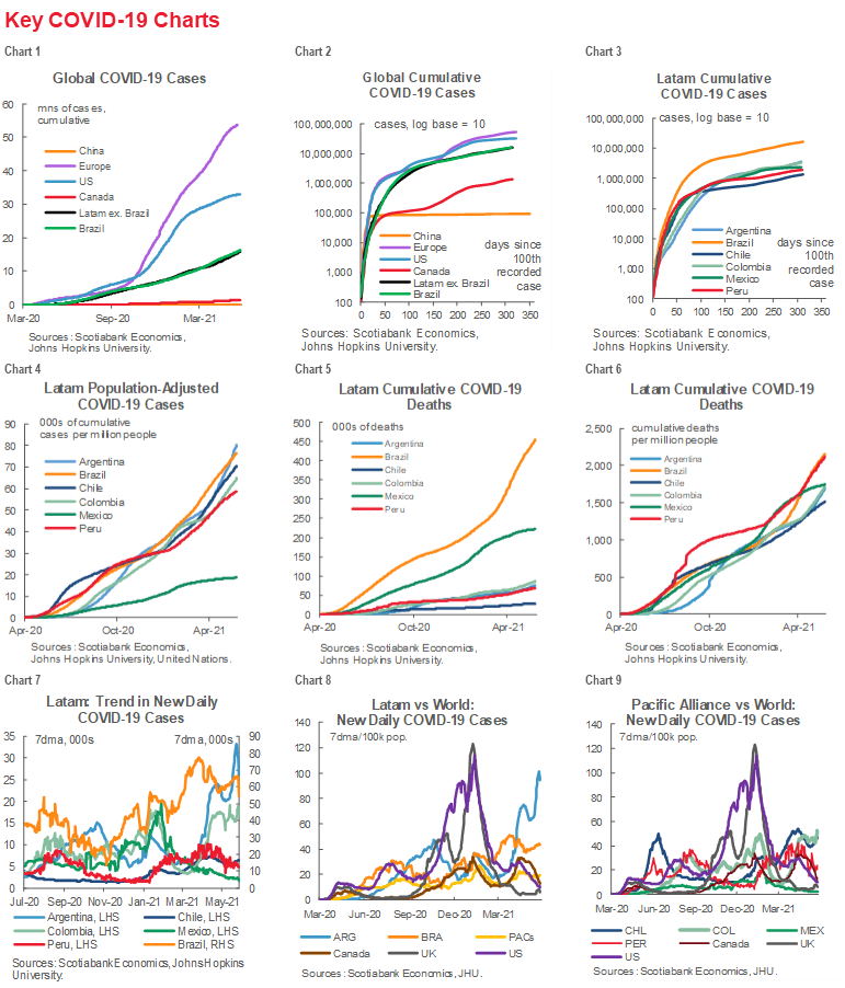 - Argentina’s recent explosion in new COVID-19 cases has focused a fresh spotlight on the pandemic’s evolution in Latam, but developments elsewhere in the region are mixed. Argentina hit an initial third surge in new COVID-19 cases in March, followed by a small breather in April, only to see new case numbers take off again in May (Key COVID-19 charts 7 and 8). As a result, the authorities announced on Thursday, May 20, that their first strict lockdown on most activities in 2021 would go into effect on Monday, May 31.