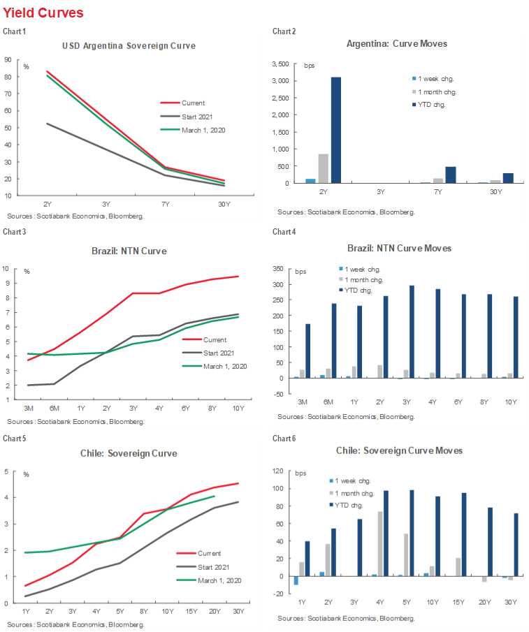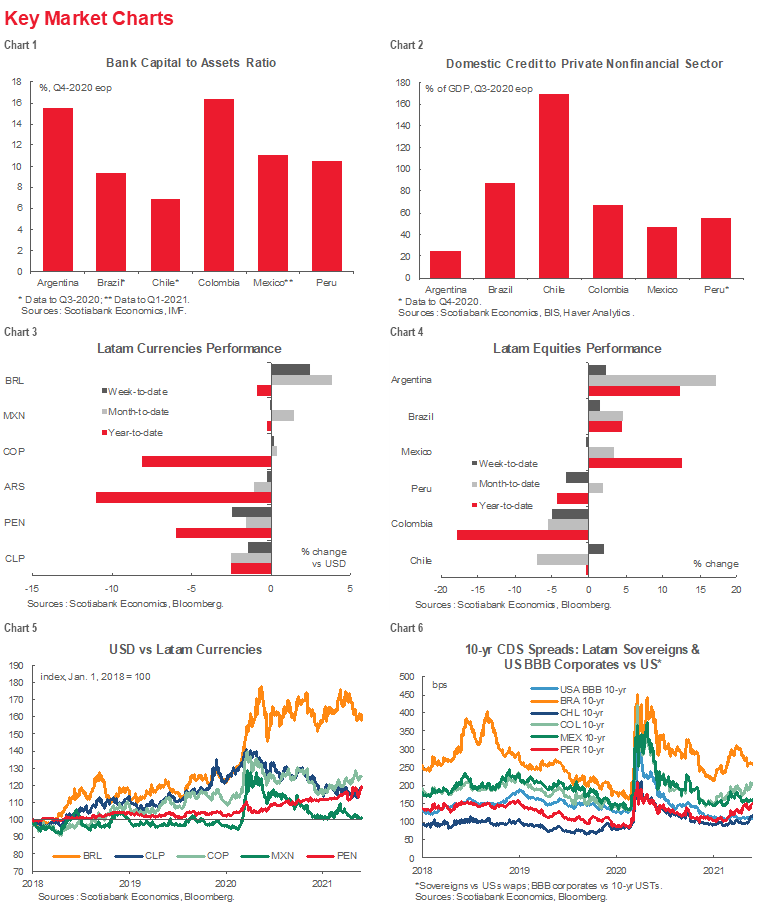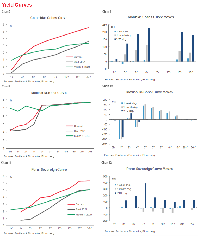 - Latam’s sovereign yield curves have risen and steepened in line with global developments so far in 2021. They have also remained notably stable as capital inflows have continued despite the recent rise of political uncertainty in some countries.