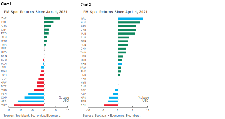 - Since the beginning of 2021, sovereign yield curves across Latam have progressively risen and in most cases steepened in response to global developments in the pandemic, inflation prints, and shifts in developed-market monetary policy expectations (see the Yield Curves section, pp. 6–7). Brazil’s initiation of the region’s first monetary-policy rate hikes has pushed its sovereign curve up the most markedly amongst its Latam peers, but all of the region’s curves have come to reflect market anticipation of higher policy rates by late-2021 or the first half of 2022. Hikes by the BCB’s Copom have helped to propel the BRL to the top of the emerging-market FX ranks (charts 1 and 2), a major turnaround anticipated by our forecasts.