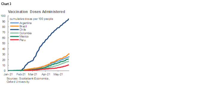 - Colombia’s new COVID-19 infection numbers have also remained stubbornly high (Key COVID-19 charts 7 and 9). A combination of some loosening in restrictions and a possible breakdown in physical distancing during political protests has combined to sustain the country’s third wave amidst a relatively slow roll-out of vaccinations compared with the rest of Latam (chart 3).