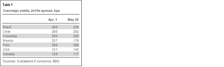 - It’s notable that the shape of sovereign yield curves has changed little since the onset of local political uncertainty during the past few weeks in Chile, Colombia, and Peru. If anything, the region’s curves have flattened somewhat (table 1), in line with developed-market yields, as capital flows have continued to remain solid into Latam.