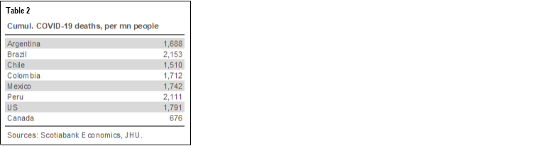 - Still, in terms of cumulative per capita COVID-19-related deaths, official statistics imply that, outside of Brazil and Peru, the rest of the Latam-6 hasn’t fared much worse than the US (table 2). That said, official statistics clearly undercount COVID-19 deaths everywhere in the world.