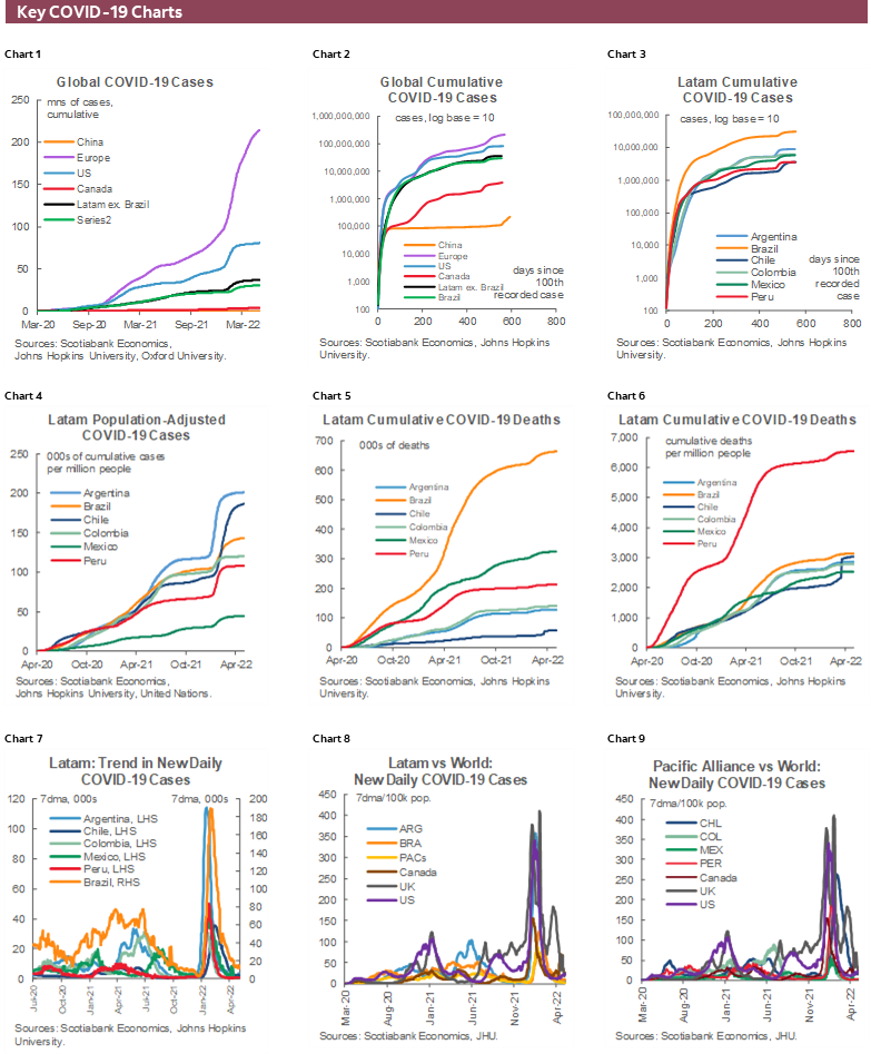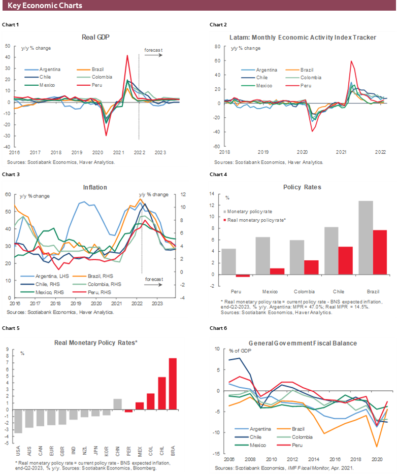 But there are signs that recoveries across the region are maturing. Strong growth in 2021 reflected the “dead cat bounce” from pandemic-induced contractions in 2020: given low bases for comparison, the re-opening of economies, as mobility restrictions were relaxed, was bound to generate high growth rates. These adolescent growth spurts are making way for slower growth, a characteristic of more mature expansions. For instance, Scotiabank’s team in Santiago notes that, while Chile’s monthly GDP data for March came in above market expectations at 7.2% y/y, the q/q contraction reflects convergence towards trend GDP. Similarly, our experts in Lima have pointed out that, with m/m growth flat, February GDP growth of 4.9% y/y may not be as strong as it appears. In Mexico, Scotiabank’s team recently highlighted the results of Banxico’s expectations survey, which shows slightly weaker growth (and higher inflation). The message here is that slowing growth does not necessarily presage issues of grave concern, even if there is a possibility, as in Chile, of a mild technical recession, as growth transitions to a more sustainable rate. Meanwhile, Colombia has closed the output gap between potential output and actual output, completing the transition from recovery to expansion.