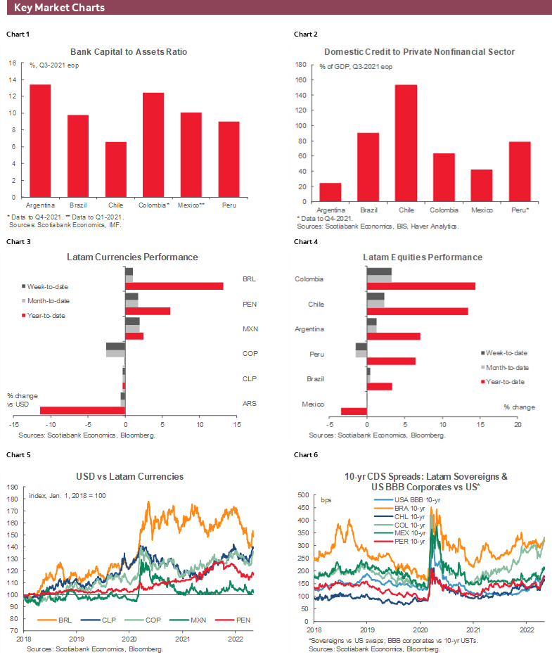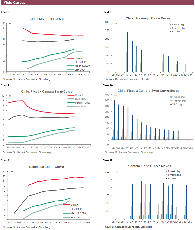 The inescapable conclusion is that, while the risk of economic expansions dying from old age seems remote, the possibility of an unnatural death is rising. But if expansions in the Latam region are murdered, to use Bernanke’s phrase, it may not be local central banks, which have been proactively rebalancing monetary conditions over the past year, that are culpable. In just the last week, Colombia’s BanRep raised its reference rate 100 bps in a more hawkish split vote while Chile's BCCh hiked its policy rate 125 bps today in a unanimous decision. Scotiabank economists across the region expect additional increases in the weeks ahead.
