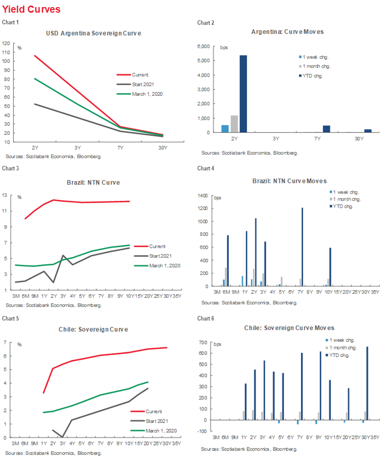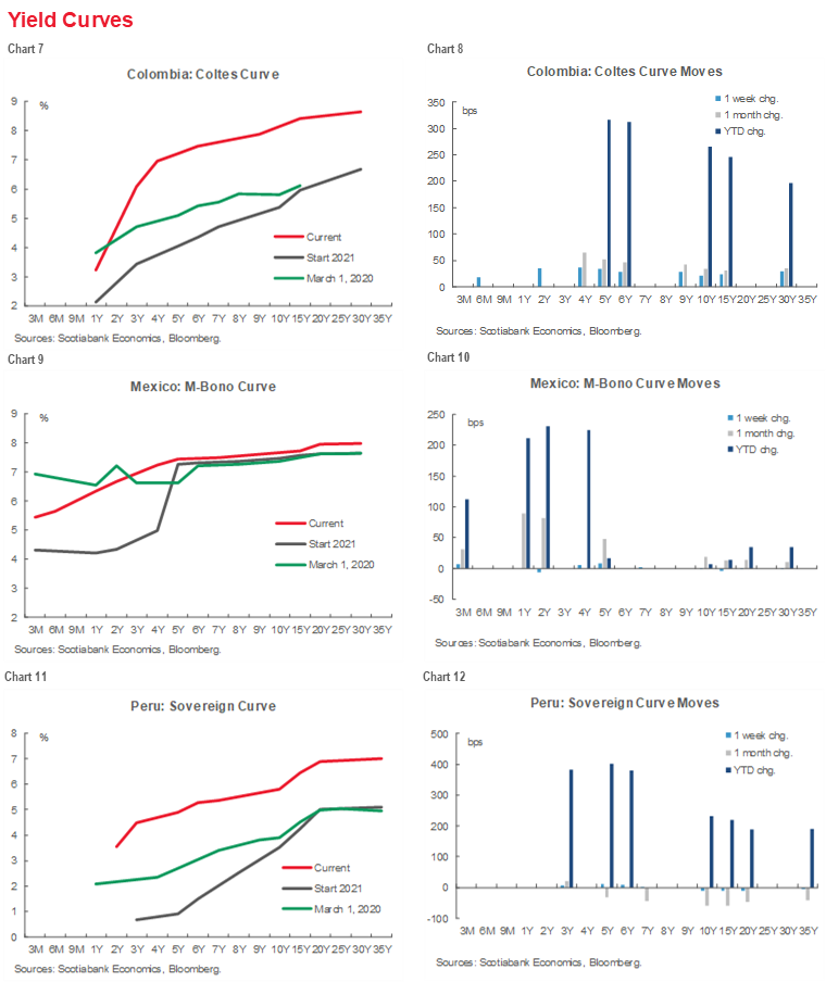 Sovereign yield curves across the Latam region have priced in the progressive rise of inflation and expectations of higher inflation since the start of the year (charts 1–12). For the most part, curves have shifted up across the maturity spectrum. Argentina (chart 1) and Mexico (chart 9), where the Mexico M-Bono curve remains firmly anchored at medium- and long-term maturities, are exceptions. In Brazil, where the BCB raised the Selic rate 150 bps October 28, yields at the short-end of the market have shifted up between 600 and 1,000 bps since the start of the year.