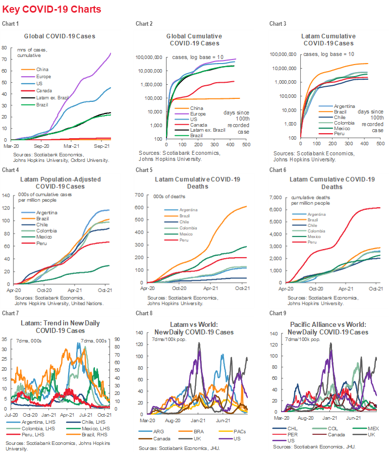 As the reversal of opening initiatives in Chile underscore, the pandemic remains a key driver of economic prospects. Charts 1–12 provide critical information for monitoring COVID-19 developments. In this regard, declines in new daily case counts (chart 7) and test positivity rate (chart 12) are encouraging, notwithstanding the uptick in Chile. So too is the progress made in terms of vaccine rollouts across the Latam region (chart 10). At the same time, the increase in cases in the UK (chart 8), which has a high vaccination rate, clearly demonstrates that the virus continues to pose a threat to recovery.