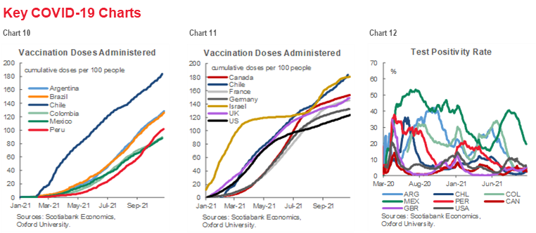 Recent developments complicate the narrative. For example, in Colombia, data on August economic activity, which fell -1.9% m/m on a seasonally-adjusted basis, suggests the recovery still faces challenges, even as the Citi survey of expected growth improved again, increasing to 8.71% y/y, up from 8.26 % y/y. Meanwhile, in Chile, the municipality of Santiago walked back its full re-opening under the “Paso a Paso” plan in the wake of a rise in COVID-19 cases and test positivity rates, despite a truly impressive vaccine rollout. And in Mexico economic activity surprised on the downside in August, with the seasonally adjusted economic activity index declining -1.6% m/m (versus 0.2% m/m consensus). The upshot here is that there is increased uncertainty about near-term growth prospects.