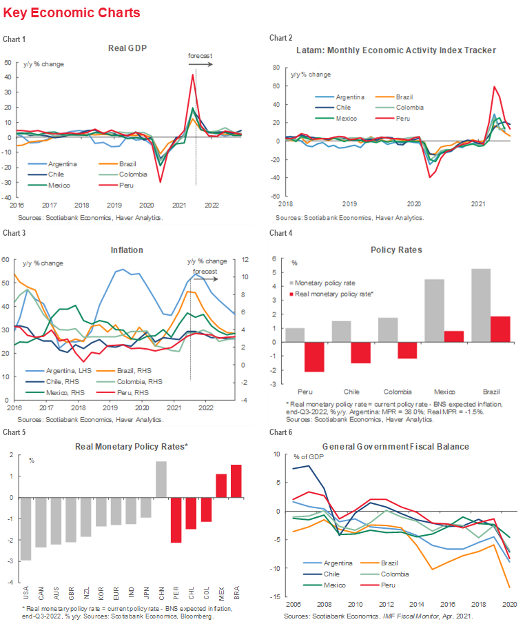 Economies of the Latam region continue to recover from the sharp collapse of economic activity early in the pandemic (chart 1). The bounce back has been particularly pronounced in Peru, which endured an especially severe contraction in 2020. While impressive, as we have consistently emphasized, high year-over-year growth rates that include base effects—the favourable comparison with 2020 levels depressed by the pandemic—will decline over time; growth is expected to converge on pre-pandemic levels in the medium term.