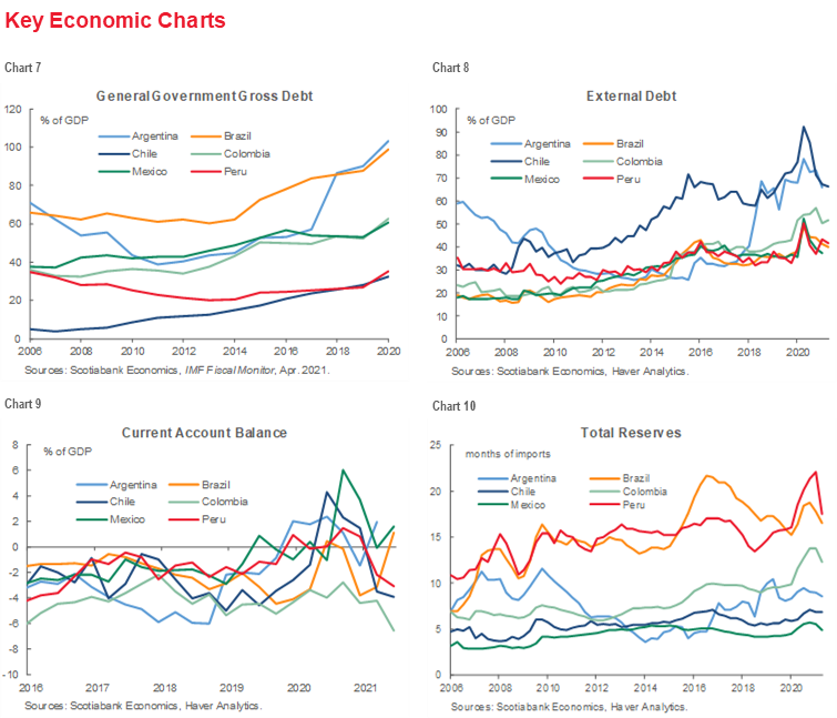 Fiscal policy, likewise, must balance continued support for individuals adversely affected by the lockdowns with long-term fiscal sustainability. Fiscal balances across the region deteriorated during the pandemic (chart 6) as governments adopted extraordinary measures to contain the economic costs of the crisis. The result has been a marked increase in gross debt as a share of GDP (chart 7). While external debt (chart 8), current account balances (chart 9) and total reserves (chart 10) are not signalling alarm, Latam governments will need to articulate clear plans to address fiscal balances and buttress their commitments to fiscal sustainability. In Colombia, President Duque recently signed new fiscal reforms into law that are aimed at achieving these goals.