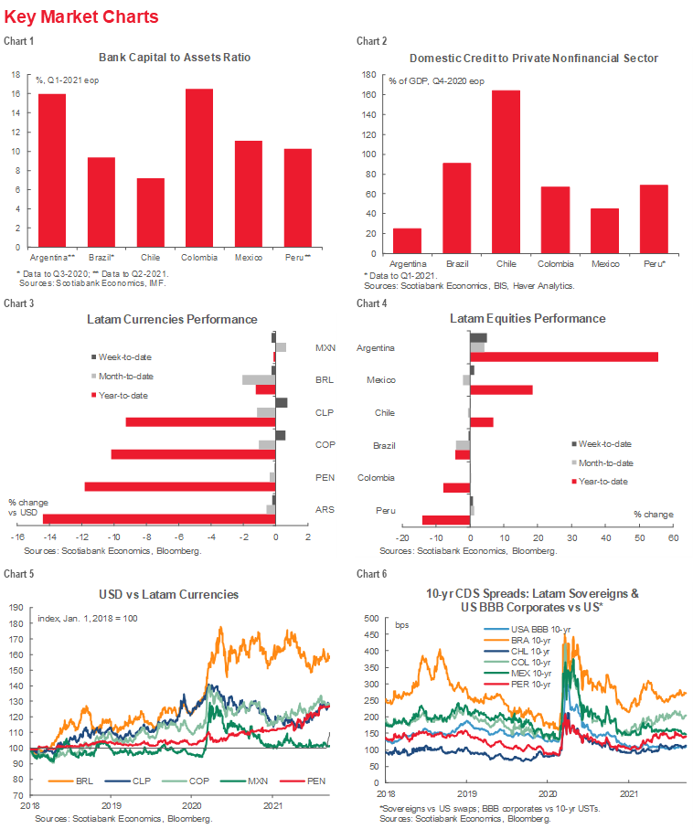 As recent editions of the Latam Weekly and the Latam Charts Weekly have highlighted, economic recovery has been accompanied by higher inflation (chart 3). All countries in the Latam region have seen inflation spike higher, though increases in Argentina and Brazil have been especially sharp. More moderate price rises have been recorded in Pacific Alliance members. These countries (and Brazil) have well established inflation-targeting regimes that help anchor expectations, though the latest inflation numbers exceed the upper bounds of those frameworks.