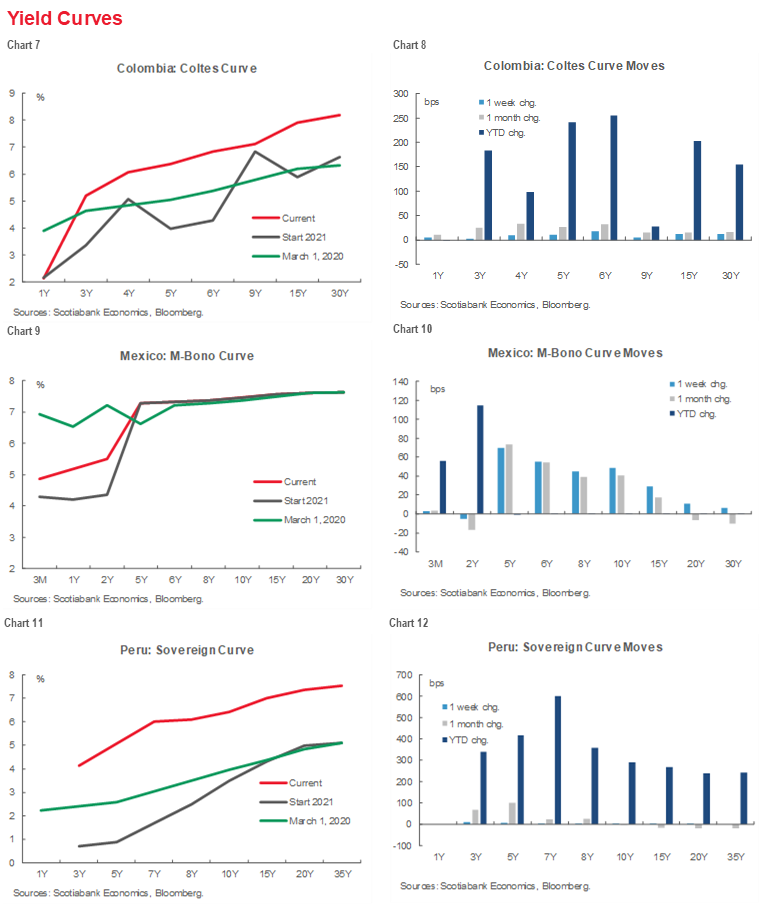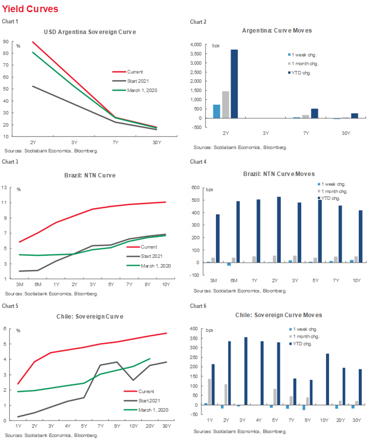 Latam sovereign yield curves have, for the most part, shifted up across the maturity spectrum since the start of the year (charts 1–12). Argentina, which has seen a steepening inversion, and Mexico, where the sovereign yield curve has been remarkably stable, are the two exceptions.