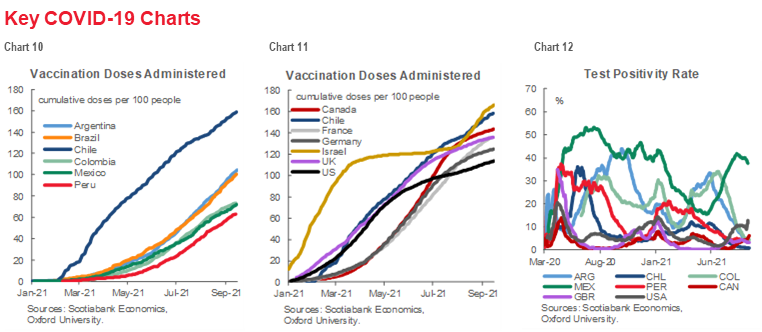 Our narrative above on the outlook is subject to continuing uncertainty with respect to the evolution of the pandemic and related policy responses (charts 1–12). Vaccines are the pathway to sustained economic growth. In this respect, Chile continues to lead the Latam region in vaccine doses administered. The progress made there offers reassurance with respect to economic growth. In contrast, the elevated test positivity rate in Mexico is a source of concern and warrants close monitoring.