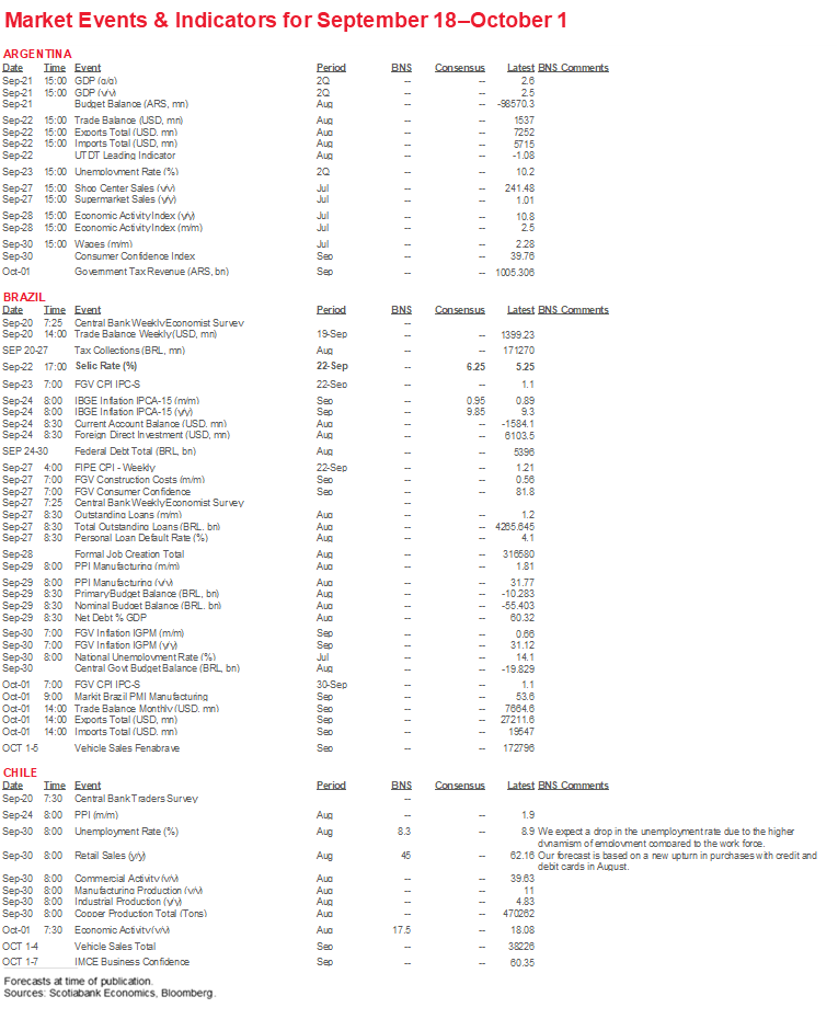 This report has been prepared by Scotiabank Economics as a resource for the clients of Scotiabank. Opinions, estimates and projections contained herein are our own as of the date hereof and are subject to change without notice. The information and opinions contained herein have been compiled or arrived at from sources believed reliable but no representation or warranty, express or implied, is made as to their accuracy or completeness. Neither Scotiabank nor any of its officers, directors, partners, employees or affiliates accepts any liability whatsoever for any direct or consequential loss arising from any use of this report or its contents.