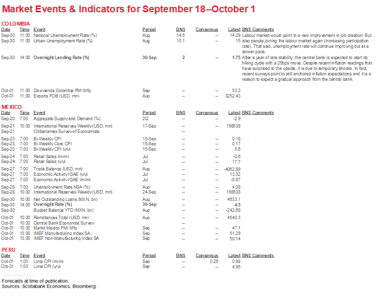 Evidence of eroding base effects is already emerging in high-frequency activity indicators, and this trend is likely to continue (chart 2). Nevertheless, the latest data remains encouraging and the overall outlook remains positive. For example, our team in Bogota reports that the latest data show manufacturing in Colombia is now at its highest historical level and that “pre-pandemic” is no longer the relevant benchmark. This recovery represents a remarkable turnaround from the situation earlier in the year, when nationwide protests disrupted production, and suggests good support for further growth going forward. Scotiabank’s team in Peru, meanwhile, reports that GDP increased by 13% (y/y) in July, indicating that the political uncertainty that followed the second round of presidential elections in June did not have much of an impact on growth. Our experts in Lima expect that y/y monthly growth rates will gradually decline consistent with their forecast of 12.3% for the year. While their estimate is higher than that of most other analysts, they are confident that other forecasts for growth will be ratcheted up. The BCRP has already indicated that it will raise its current forecast of 10.7%. At the same time, the latest employment and unemployment rate data for Lima, which show a pause in employment growth and a slight increase in the unemployment rate, are a reminder that recovery is not necessarily a linear process.