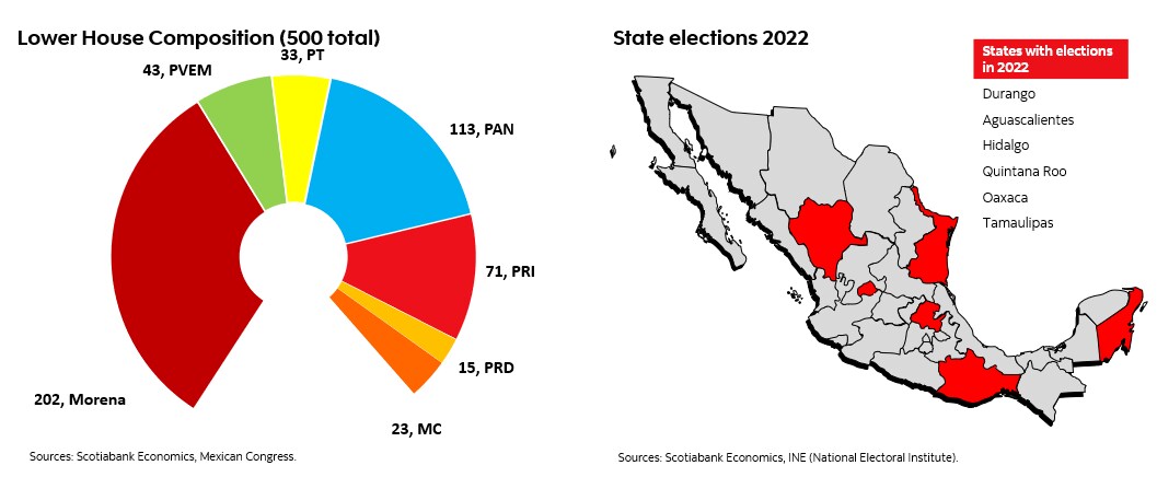 President AMLO’s administration needs more support for constitutional reforms. Key elections could realign legislature: Presidential mandate referendum and six state elections will take place in 2022.